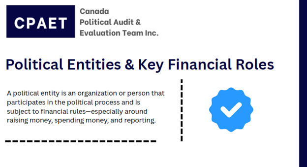 A plain-language overview of common political entities (Candidate, EDA, Party, Leadership/Nomination, Third Party) and the key financial roles responsible for compliance.