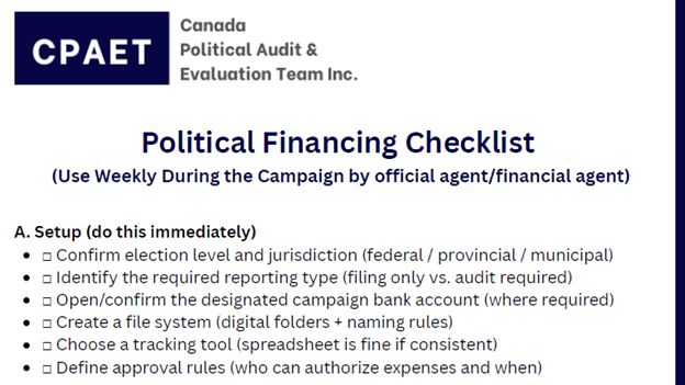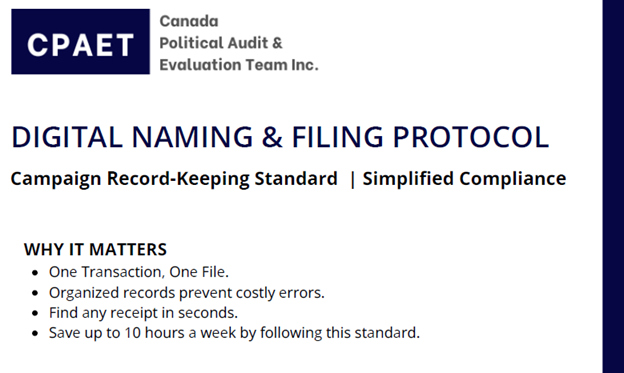 CPAET supports Political Financing Filing and Audit in Canada. Browse our free, expert-vetted templates and guides designed for Financial Agents/Official Agents, CFOs, and Third Parties to improve recordkeeping, stay organized, and prepare a clean reporting package for filing or audit.